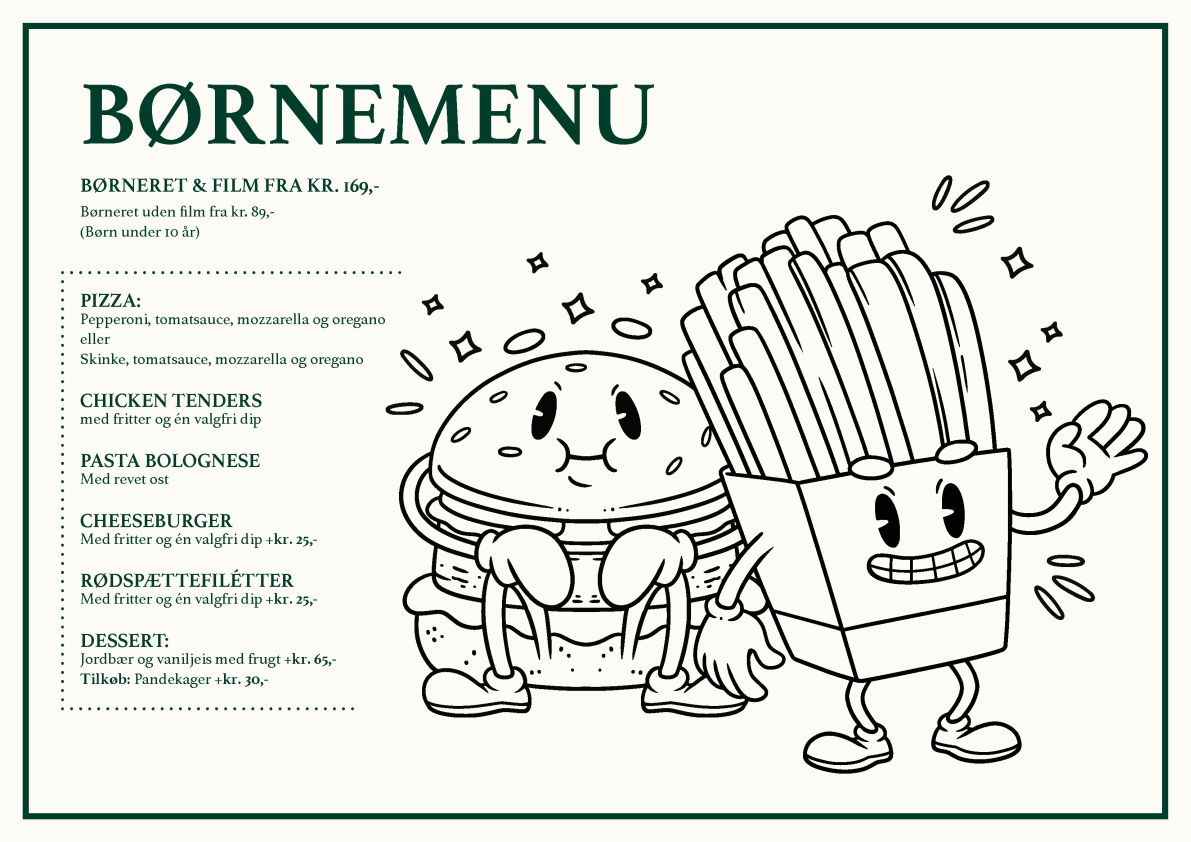Er I flere end 10 personer, anbefaler vi, at der reserveres bord minimum 1t 30m før filmen starter, samt at menuen forudbestilles på vores hjemmeside eller ved at kontakte Caféen, sådan at vi kan levere en god oplevelse af høj kvalitet med begrænset ventetid.